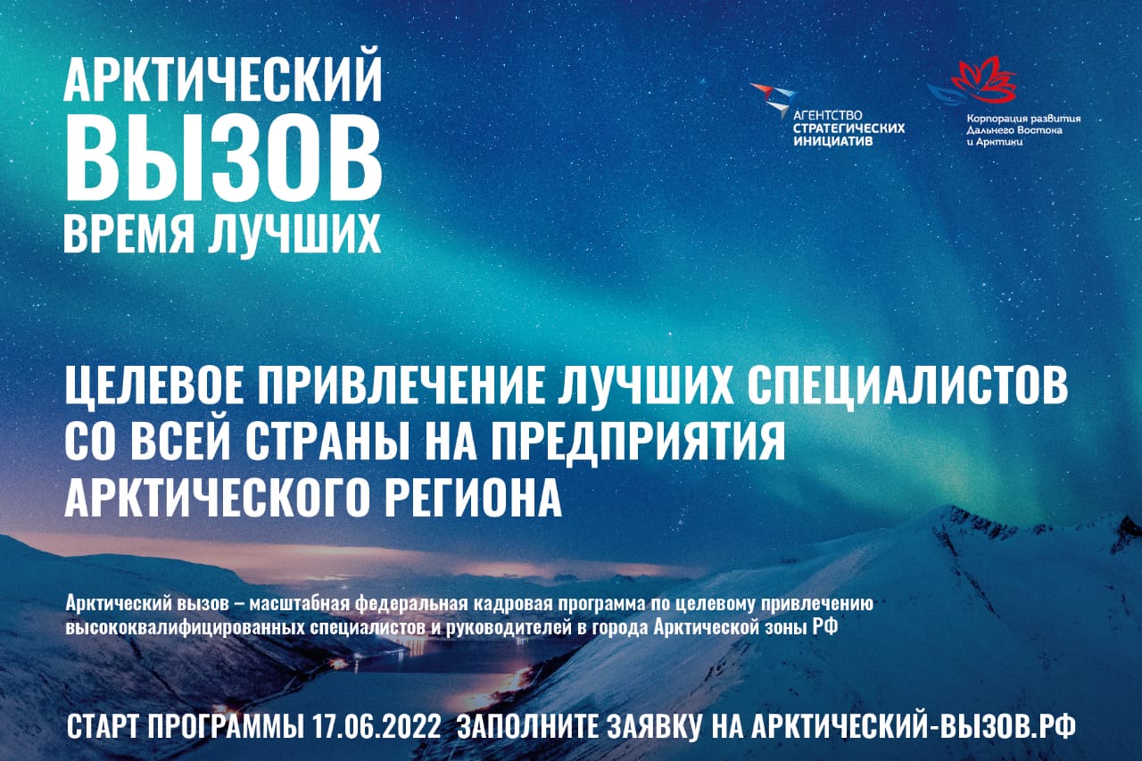 20.07.2022«Арктический вызов» ждет своих участников 17 июня начался прием заявок на участие в самой масштабной федеральной программепо привлечению высококвалифицированных кадров в арктическую зону – «Арктическийвызов».«Арктический вызов» – совместный проект Корпорации развития Дальнего Востока иАрктики(КРДВ)иАгентствастратегическихинициатив(АСИ)приподдержкеМинвостокразвития России и Союза Живые города.Арктическаязона–развивающийсярегионРоссиисбольшимколичествоминновационных проектов и программ, открывающих возможности для 50 000 рабочихмест в будущем. «Арктический вызов» сейчас – это программа быстрого привлечениявысококвалифицированных специалистов и руководителей из всех субъектов России наруководящие вакансии в правительствах и на ведущих предприятиях 9 регионов Арктики.Прием заявок осуществляется на сайте арктический-вызов.рф по 9 направлениям: •Градостроительство и ЖКХ; •СМИ и информационные технологии; •Экономика и управление; •Медицина и здравоохранение; •Образование и культура; •Природопользование и экология; •Туризм ; •Энергетика и промышленность; •Социальная сфера. Каждому участнику программы необходимо успеть оставить свою заявку до 15 июля,пройти онлайн-отбор, групповой очный отбор и индивидуальные собеседования спотенциальными работодателями. Трудоустройство прошедших все три этапа отбораучастников планируется завершить до конца 2022 года.Подробности и новости программы смотрите на сайте: https://арктический-вызов.рф/